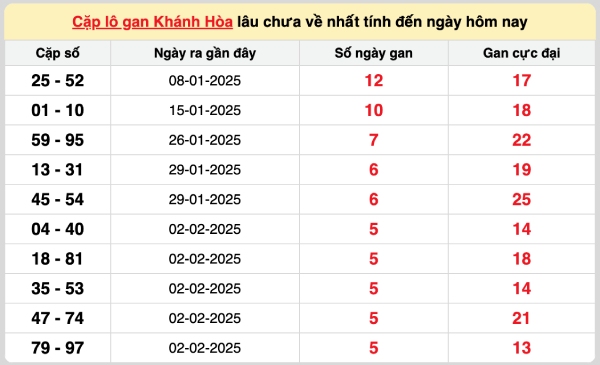 Xổ số Khánh Hòa hiện ghi nhận nhiều cặp số lâu chưa xuất hiện, với các mức độ gan khác nhau. Dưới đây là danh sách chi tiết những cặp lô gan lâu nhất: